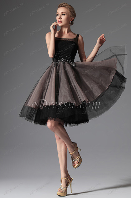 If you have no idea what to wear for your party, then wear black! It is never wrong to wear a little black dress!The airy skirt,the lace applique on the waist part of this dress will refresh your look!