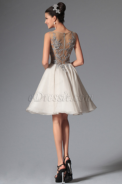 This cocktail dress features a very alluring illusion bodice, that has delicate lace applique accented with sparkling beadings. Flowy chiffon skirt adds a vivid look. You'll be head turner once you enter the room. Be the spotlight and rock your look!