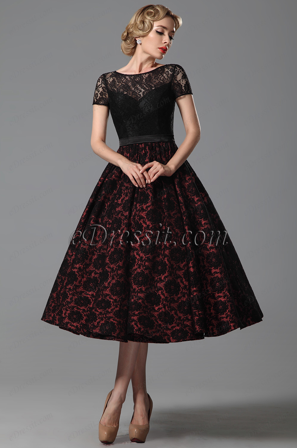 Short lace sleeves, illusion sweetheart neckline along with a floral textured skirt, this dress can show your best taste. Style your look with a pair of elegant heels to add more taste to your look!